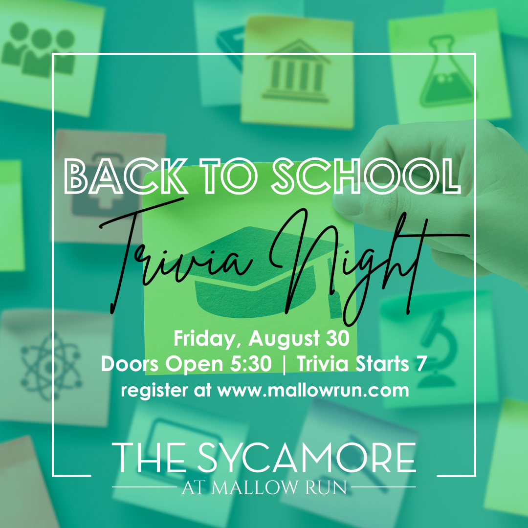 FRIDAY, AUGUST 30th It's time to go Back to School! Test your general knowledge and determine if you're smarter than the teachers at The Sycamore at Mallow Run! Join us...