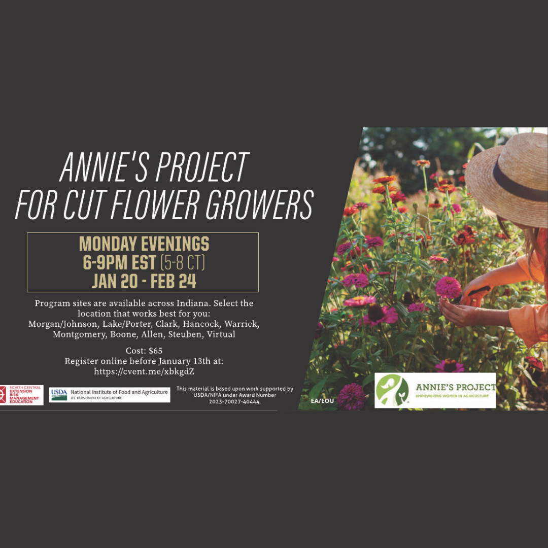 The Sycamore at Mallow Run 7070 W Whiteland Road, Bargersville, IN, United StatesJANUARY 20, 2025 - FEBRUARY 24, 2025 Monday evenings from 6-9pm at The Sycamore at Mallow Run Join us for an Annie's Project class on risk management specifically aimed at cut flower growers! This workshop provides production and business management skills to new and aspiring women farmers who face unique challenges in the cut flower...