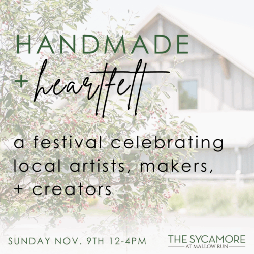 SUNDAY, November 9th 12-4pm Handmade+Heartfelt Festival celebrating local artists, creators and makers Get your holiday shopping done early while visiting local vendors at The Sycamore at Mallow Run (7070 W. Whiteland Road, Bargersville IN) CLICK HERE for more information |
