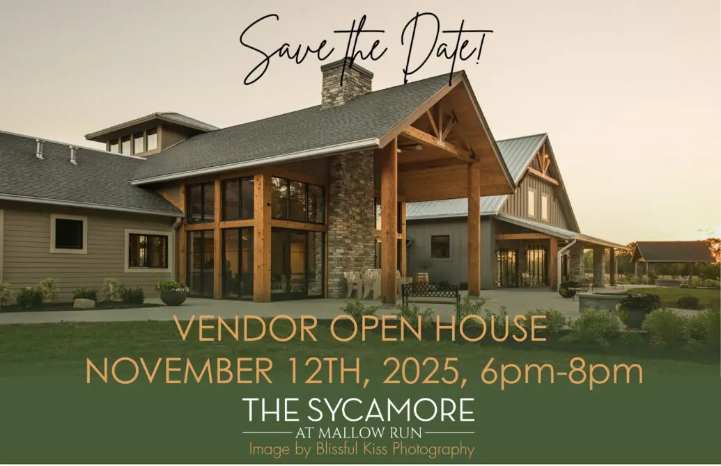 WEDNESDAY November 12th, 2025 6-8pm Come explore The Sycamore at Mallow Run and chat with our recommended wedding vendors, including caterers, florists, photographers, specialty rentals, musicians, and more! There is no cost to attend. We’d love to see you there! The Sycamore at Mallow Run is located at 7070 W. Whiteland Rd – two driveways... |