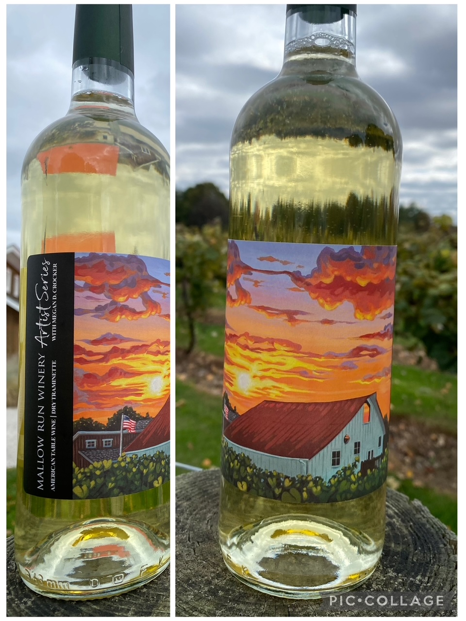 Celebrating our 20th Anniversary, Megan has captured a memorable sunset over the Tasting Room.  Enjoy this work of art while sipping the artwork within, our Dry Traminette wine.